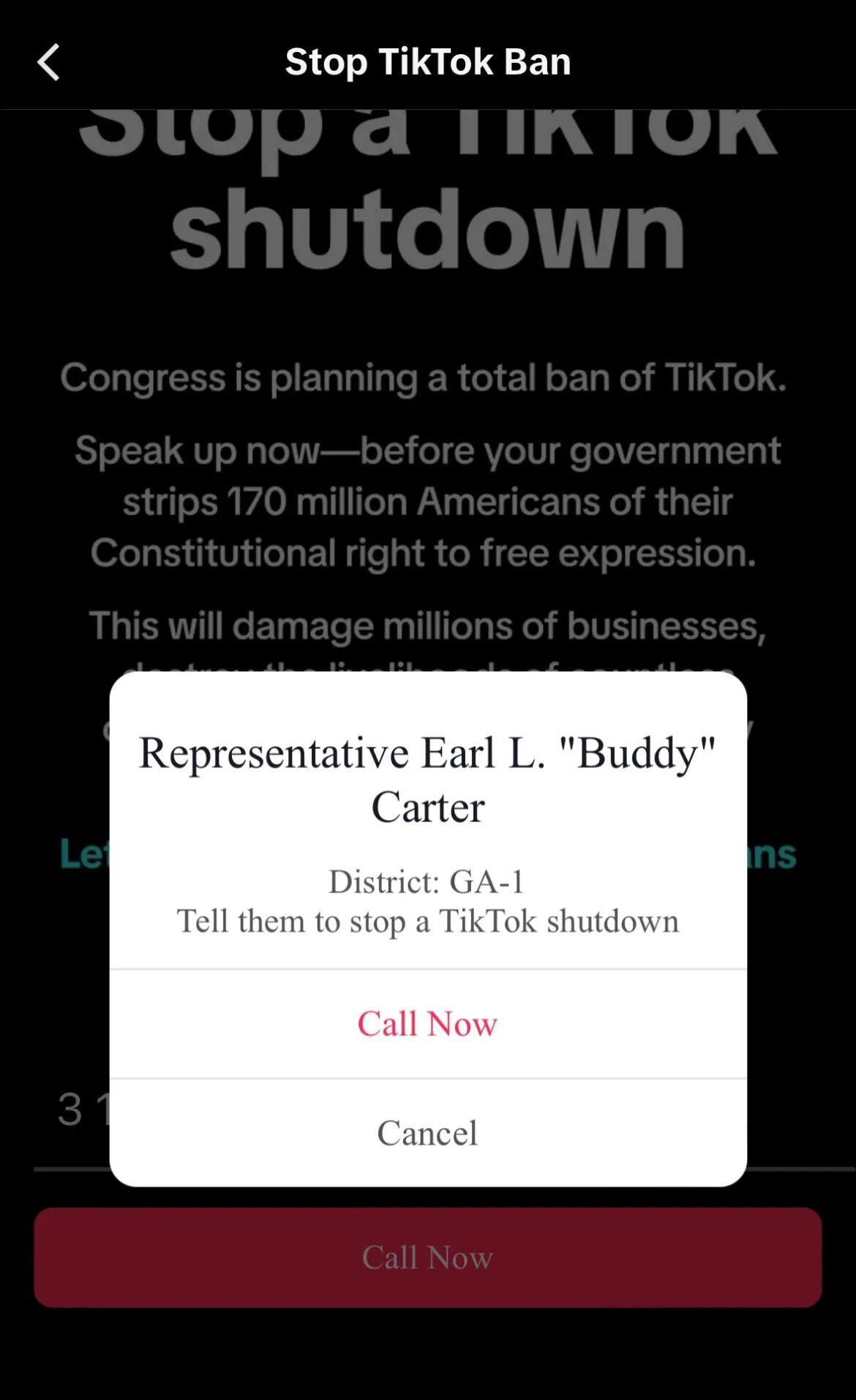 Clearly missing the irony of the situation, TikTok’s team had retrieved the location data of every user and matched it with their Congressional District. At the bottom of this urgent message was a big red button that dialed out to the corresponding congressperson.