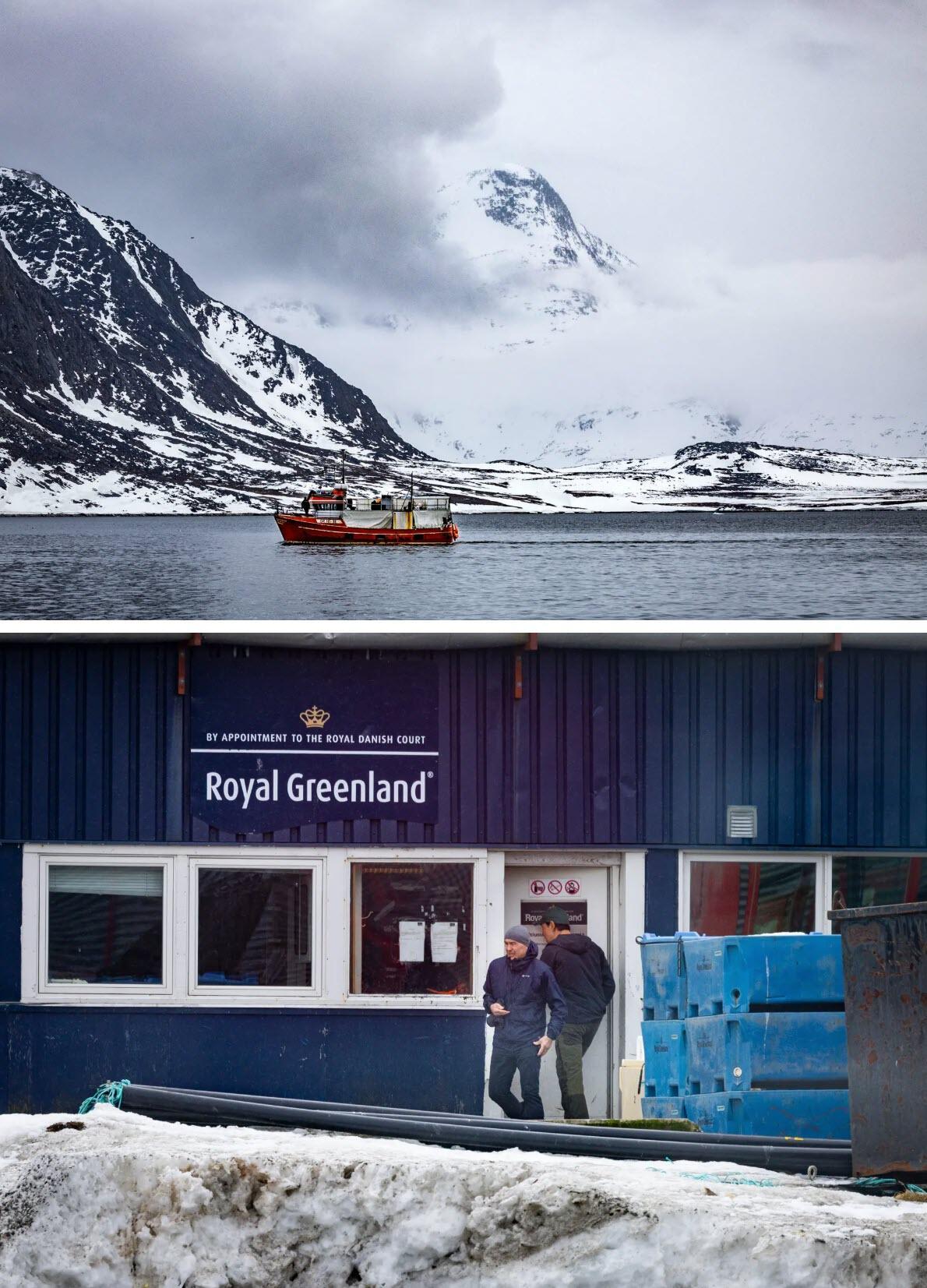 (Top) Fishermen travel Arctic waters near Nuuk, Greenland, on May 4, 2025. Shrimp and fish make up more than 90 percent of Greenland's current exports. (Bottom) Boaters leave the offices of Royal Greenland near Nuuk, Greenland, on May 5, 2025. John Fredricks/The Epoch Times