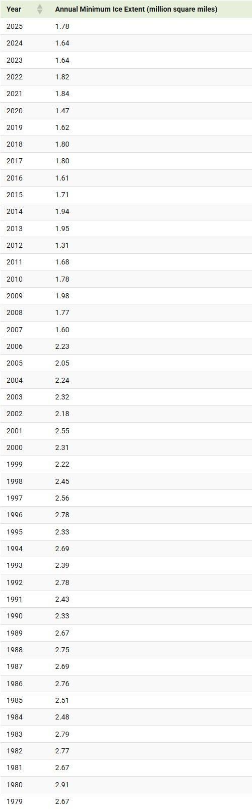 Below, we show the annual minimum Arctic ice extent over the past several decades.
