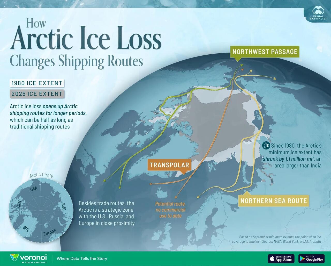 This graphic, via Visual Capitalist's Dorothy Neufeld, shows how Arctic ice loss is redrawing shipping routes, based on data from multiple sources, including NASA, World Bank, NOAA, and ArcData.