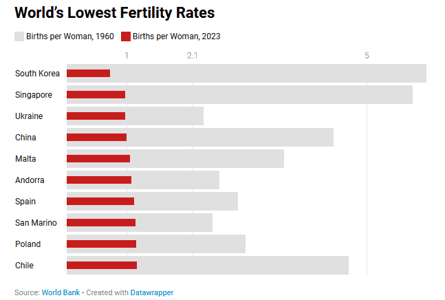 Asian and European countries have the lowest fertility rates in the world, and South Korea (0.72), Singapore (0.97), Ukraine (0.977), and China (0.999) all have rates below one.