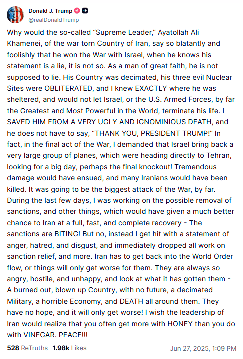 Meanwhile, the IAEA's Grossi has expressed doubts: "There is a chance that much of Iran's highly enriched uranium survived Israeli and U.S. attacks because it may have been moved by Tehran soon after the first strikes, U.N. nuclear watchdog chief Rafael Grossi said on Wednesday," according to Reuters.