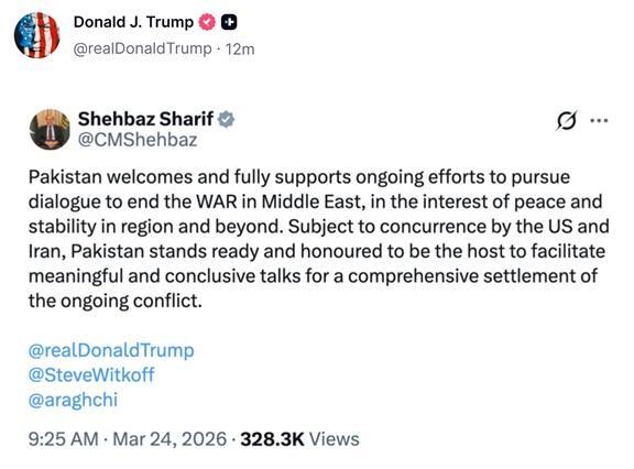 Both Pakistan and Qatar have stepped up mediation efforts, with chatter that Islamabad could play host to future Iranian and US talks. Despite the rumors of ongoing backchannel communications, and President Trump himself insisting Sunday into Monday this is happening, there's as yet no clear evidence that Tehran and Washington are actually dialoguing. Pakistan’s Foreign Ministry has told Al Jazeera that Islamabad is ready to host talks between the US and Iran: "If the parties desire, Islamabad is always willing to host talks," Foreign Ministry spokesman Tahir Andrabi said. Andrabi’s comment came a day after Trump put on hold, for a period five days, his threat to bomb Iranian power plants.