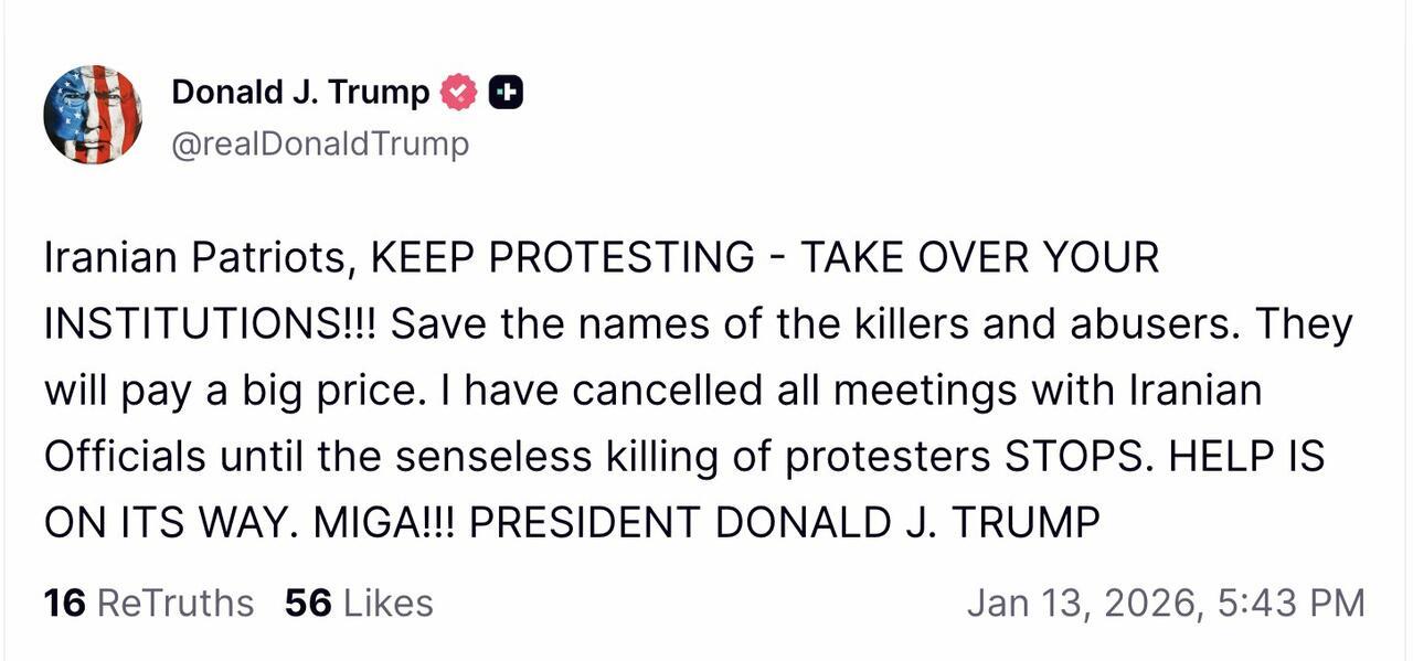 Trump further said he has canceled all meetings with Iranian officials, after yesterday's reports that the two sides were looking to jump-start diplomacy of official contacts if Tehran leaders cooperate, and don't kill any protesters. But now Trump is doing his typical thing of quickly ratcheting pressure to the max. He's reiterated that HELP IS ON THE WAY - suggesting military intervention could be imminent, in the following Truth Social statement.