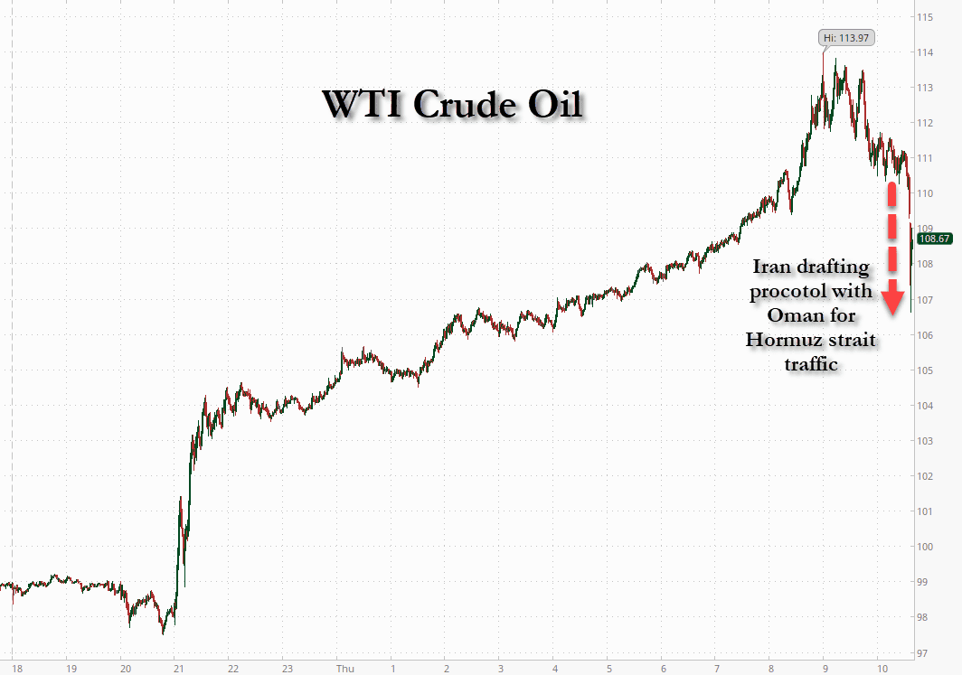 After earlier headlines suggesting a prolonged war (and thus Hormuz closure), this note of optimism has pushed oil prices down once again: