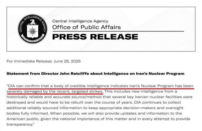 "The devastating US strike on Fordow destroyed the site's critical infrastructure and rendered the enrichment facility inoperable. We assess that the American strikes on Iran's nuclear facilities, combined with Israeli strikes on other elements of Iran's military nuclear program, has set back Iran's ability to develop nuclear weapons by many years," the statement reads.