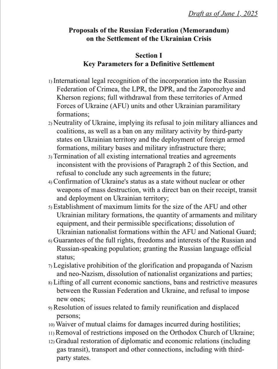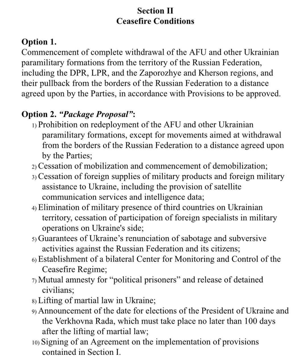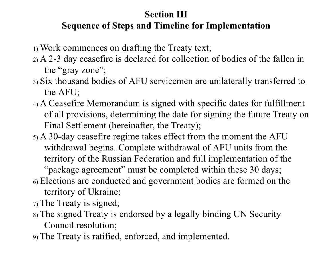 Below is what Russian sources are circulating, identifying the full list of Russia's peace proposals as handed over to the Ukrainian side, which is going to be studied: