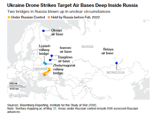 In a historic drone attack, Ukraine decimates over 40 Russian strategic bombers on their home bases, including in the Arctic and in Siberia.