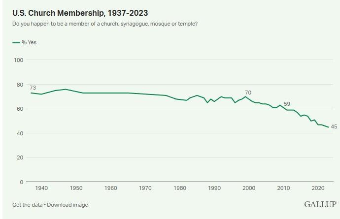 I would argue that America’s crisis stage was 9/11. It was a war combined with an economic collapse. Interestingly, this date also coincides with America’s declining religiosity. In 2000, 68% of Americans reported belonging to a church, synagogue, temple, or mosque. Today it’s just 45%.