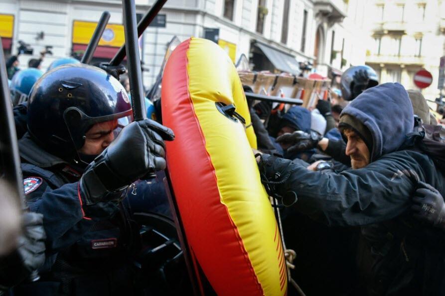Police officers and demonstrators clash during an anti-fascist and anti-racist march to protest against a Lega Nord party general election campaign rally on Piazza Duomo in Milan on Feb. 24, 2018. Francesca Volpi/Getty Images