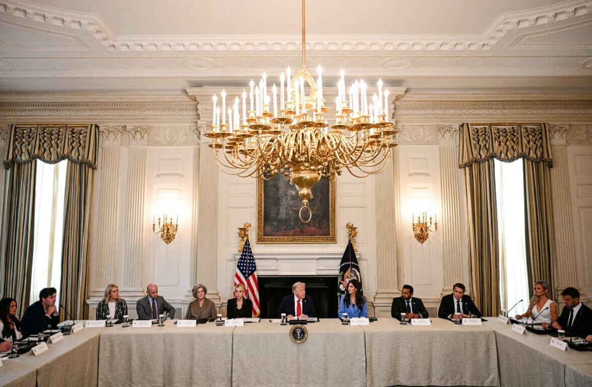 President Donald Trump (C) chairs a roundtable about Antifa in the State Dining Room of the White House on Oct. 8, 2025. The foreign terrorist organization designation followed Trump’s September order labeling Antifa a domestic terrorist organization. Jim Watson/AFP via Getty Images