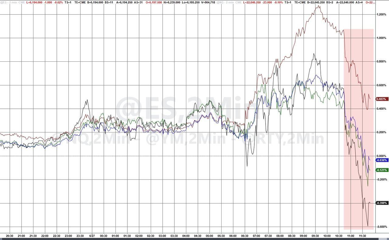 US stocks and the Canadian dollar are sliding after President Trump announces on TruthSocial that the US is terminating all trade discussions with his northern neighbor due to Carney putting a tax on US tech firms (like Europe):