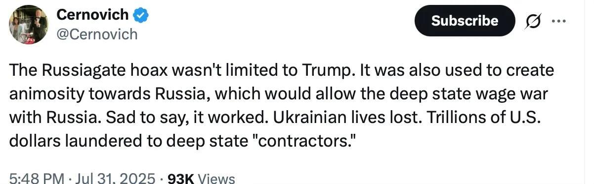 You might suspect that Mr. Trump has to pretend to be tough with Russia to counter the still-lingering suspicion — germinated by the Hillary Clinton campaign a decade ago — that he is “Putin’s puppet.” By coincidence, strange or not, that trope is now unraveling with the release of the RussiaGate intel archive that the rogue DOJ and FBI squirreled away since the Trump 1.0 term in office. Mr. Patel found a trove of documentary evidence in a burn-bag in a back room at FBI headquarters. DNI Tulsi Gabbard retrieves more previously-hidden evidence by the day from the vast NSA data base. It ought to be clear now that the initial Hillary Clinton campaign prank metastasized into the worst perversion of abusive government power in our country’s history, and is yet on-going.
