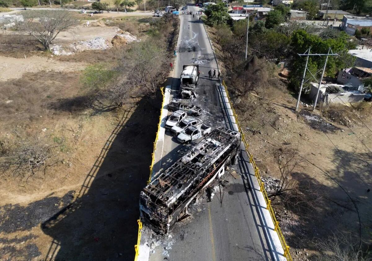 Aerial view of burned vehicles over the La Desembocada bridge in Puerto Vallarta, Jalisco State, Mexico, on Feb. 24, 2026. Alfredo Estrella/AFP via Getty Images