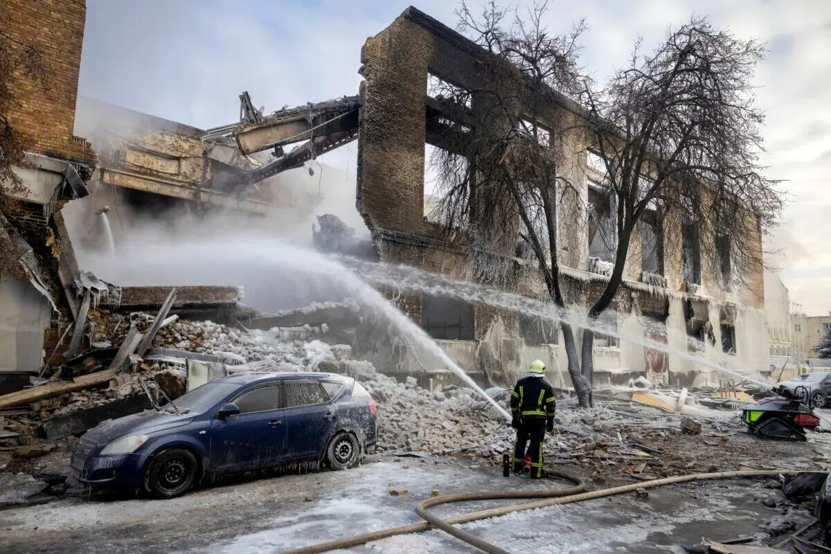 A firefighter douses a building hit by a Russian drone in Kyiv, Ukraine, on Jan. 12, 2026. Thomas Peter/Reuters