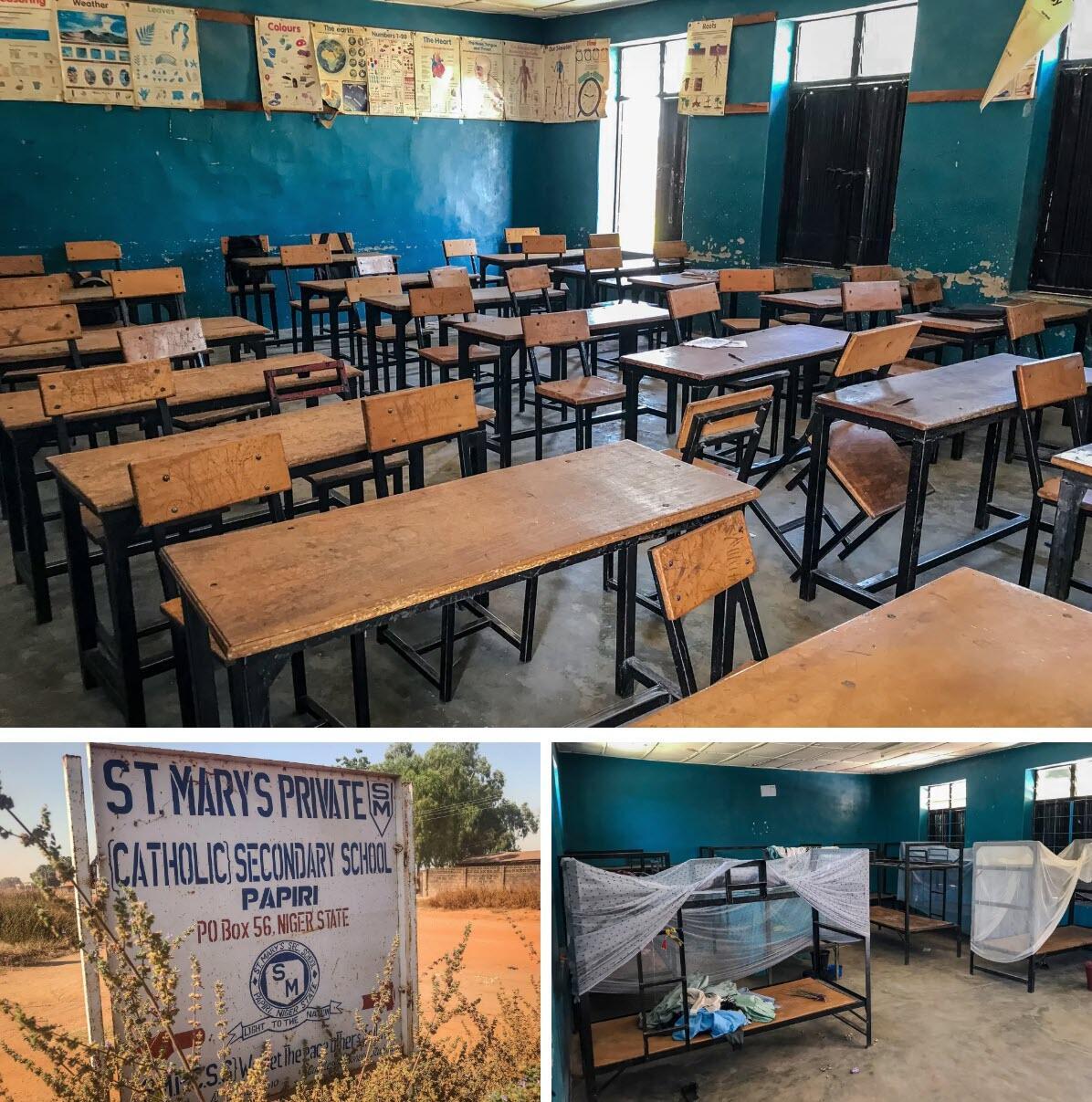 (Top) A general view of a classroom at St. Mary's Catholic School in Papiri, Agwarra local government, Niger state, Nigeria, on Nov. 23, 2025. (Bottom L) A signboard for St Mary's Private Catholic Secondary School stands at the entrance of the school in Papiri, Agwarra local government, Niger state, Nigeria, on Nov. 23, 2025. (Bottom R) A general view of empty bunk beds and scattered belongings inside a student dormitory at St. Mary's Catholic School in Papiri, Agwarra local government, Niger state, Nigeria, on Nov. 23, 2025. Ifeanyi Immanuel Bakwenye/AFP via Getty Images
