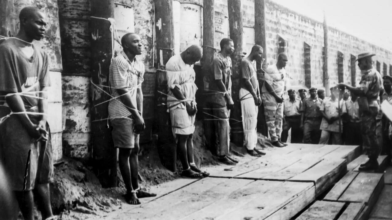 Six men condemned for armed robbery stand before their execution by firing squad at Kirikiri Prison in Lagos, Nigeria, on Feb. 21, 1998. Since Nigeria’s 1999 return to civilian rule, 12 northern states have reintroduced Islamic criminal law, known as sharia, which human rights advocates say has been used to justify mob violence and state-sanctioned capital punishment. AFP via Getty Images