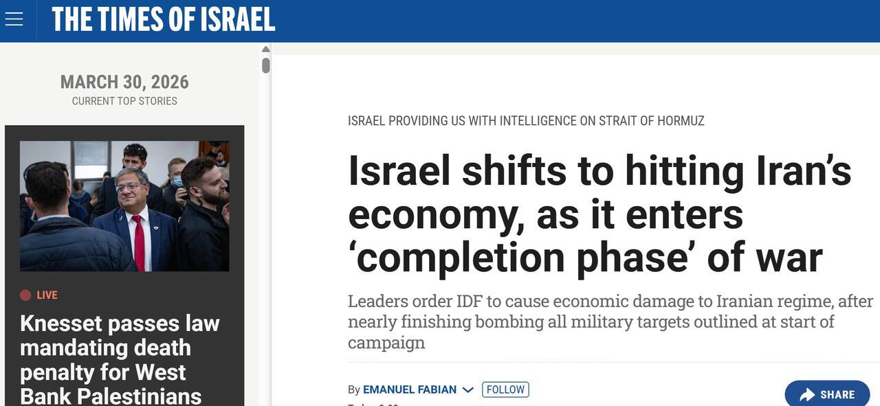 "A month into the war with Iran, the Israeli military has almost completed bombing all of the targets it defined for itself at the start of the conflict, and has now been ordered by Israel’s political leadership to shift to hitting 'economic' targets of the Iranian regime," the publication wrote.