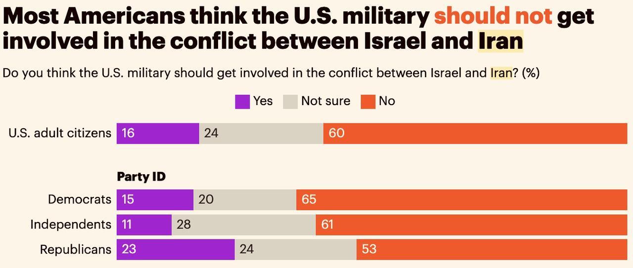 According to an Economist/YouGov poll taken between June 13 and 16, only 16% of Americans "think the US military should get involved in the conflict between Israel and Iran. In an even more significant finding, only 19% of people who voted for Trump in 2024 support American military involvement. (23% of all self-identified Republicans support going to war.) Similarly, 56% of all Americans say the United States should engage in negotiations with Iran. That avenue has even greater support among Trump supporters -- with 63% advocating negotiations.