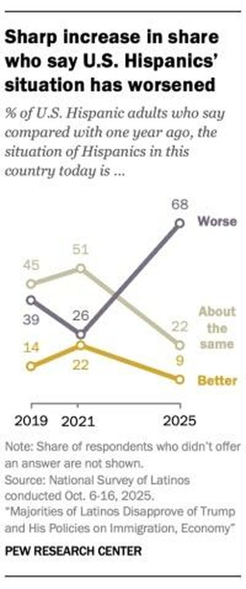 For the first time in nearly two decades of our national surveys of U.S. Hispanics, most say Hispanics’ situation in the country has worsened over the past year. About seven-in-ten Latinos (68%) now express this view, up sharply from 26% in 2021 during the Biden administration and 39% in 2019 during the first Trump administration. In the most recent survey, 9% of Latinos say their group’s situation is better than it was a year ago, and 22% say it’s about the same.