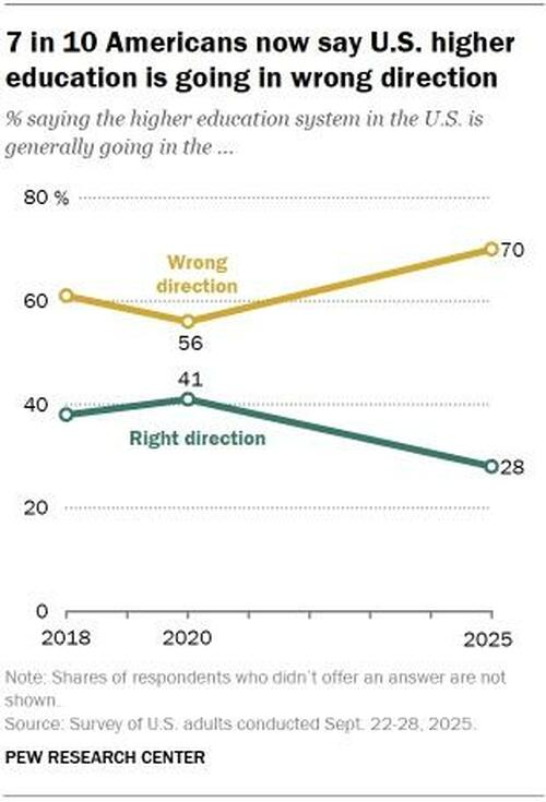 Seven-in-ten Americans now say the U.S. higher education system is generally going in the wrong direction – up from 56% in 2020. Views of the nation’s colleges and universities have turned more negative among Republicans and Democrats alike. (In this analysis, Republicans and Democrats include independents who lean toward each party.)