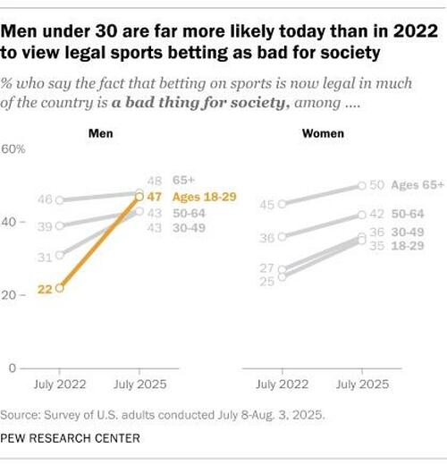 One of the biggest shifts in attitudes has occurred among men under 30. In this group, 47% say legal sports betting is a bad thing for society, an increase from 22% in 2022. For women under 30, the shift is smaller: 35% now see legal sports betting as bad for society, up from 25%.