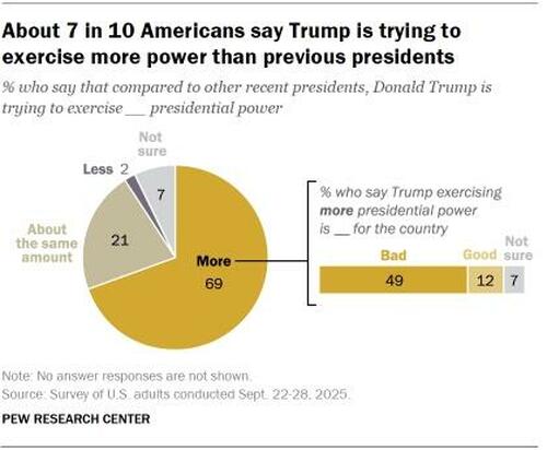 Most of those who say this view it as a bad thing for the country. Overall, 49% of U.S. adults say Trump is trying to exercise more presidential power than previous presidents and that this is bad for the country.