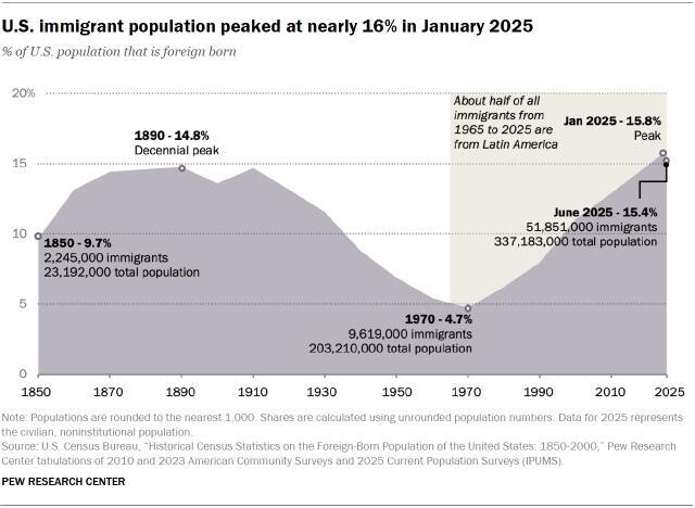 After more than 50 years of rapid growth, the number of immigrants living in the United States is on the decline. In January 2025, there were 53.3 million immigrants in the U.S., making up close to 16% of the country’s population. Both the number and the share were record highs. But by June 2025, the nation’s immigrant population decreased by more than a million, to 51.9 million. That decline has likely continued since, due to deportations, voluntary departures and fewer new arrivals.