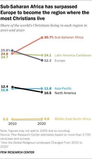 Sub-Saharan Africa is now home to more Christians than any other world region, surpassing Europe. As of 2020, about 31% of the world’s Christians live in sub-Saharan Africa, while 22% live in Europe. This change has been fueled by Africa’s much higher fertility rates, but also by widespread disaffiliation from Christianity in Western Europe.