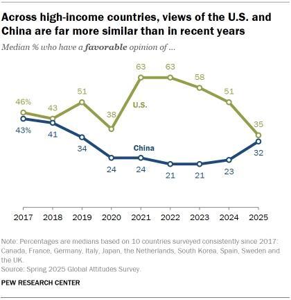 Views of the U.S. have worsened – and views of China have improved – across many of the 10 high-income countries we surveyed this year. Across these countries, a median of 35% of adults now say they have a favorable opinion of the U.S., while 32% say the same about China. These shares are the closest they’ve been since 2018.