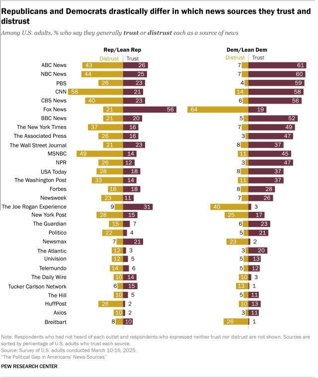 Partisans differ sharply on which news sources they trust, especially when it comes to Fox News and CNN. More than half of Republicans (56%) say they trust Fox News, but 64% of Democrats say they distrust it. The reverse is true for CNN: 58% of Democrats trust it, while the same share of Republicans distrust it.