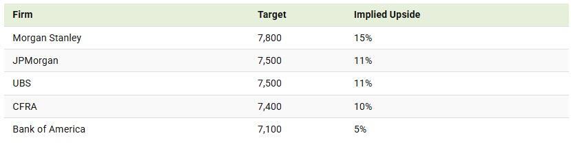 The bull case from JPMorgan sees the index potentially topping 8,000 if the Fed eases more than expected. Morgan Stanley calls it their most bullish outlook in years, driven by returning operating leverage, AI efficiency gains, accommodative tax and regulatory policy, and contained interest rates.
