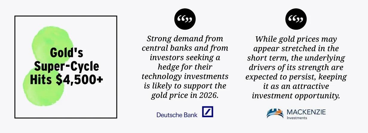 Gold remains a favorite. Morgan Stanley targets $4,500 per ounce—about 9% upside from current levels. The World Gold Council notes that gold achieved over 50 all-time highs in 2025 and may post its fourth-strongest annual return since 1971.