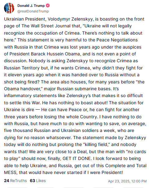 Trump is clearly not happy in the wake of Zelensky's Tuesday remarks wherein he asserted that Ukraine will not legally recognize Russia's occupation of Crimea under any circumstances,