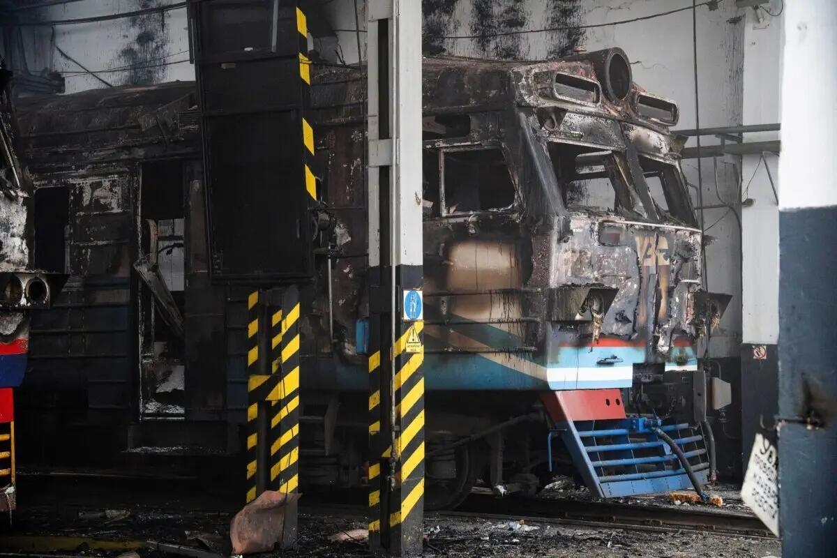 Charred electric trains are seen in a damaged depot in the town of Fastiv, Kyiv region, after an air attack, on Dec. 6, 2025, amid the Russian invasion of Ukraine. Serhii Okunev/AFP via Getty Images