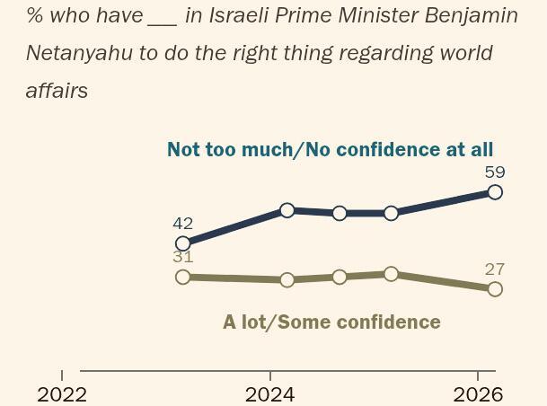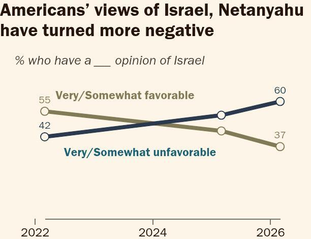 While Pew didn't explore the drivers of Israel's steadily-sagging standing with Americans, it's safe to say that Israel's wholesale destruction of Gaza and skepticism over the rationale for US-Israeli warfare on Iran last summer and again this year have played a big part.