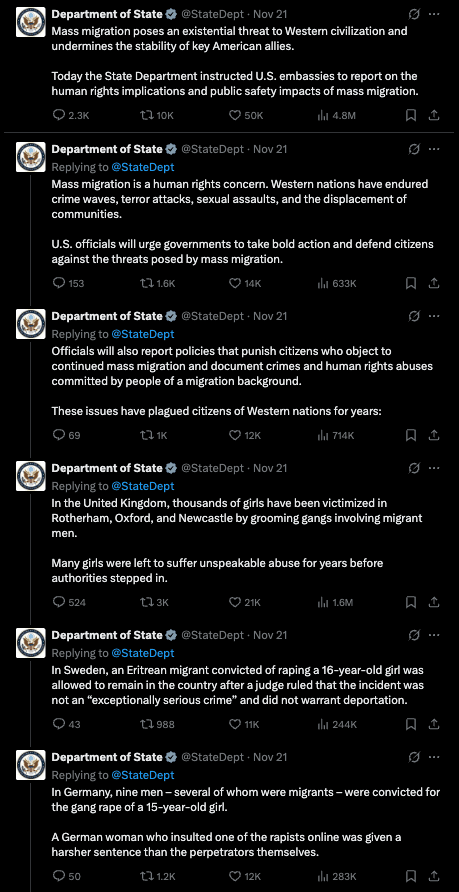 "Today the State Department instructed U.S. embassies to report on the human rights implications and public safety impacts of mass migration," State's X account wrote in a series of posts on Friday.