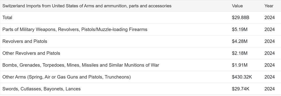 Switzerland Imports from United States of Arms and ammunition, parts and accessories: But an important distinction is that the move only impacts official defense and military-use items.