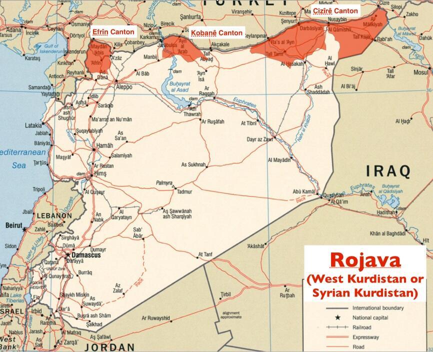 Map: the height of the Rojava project prior to fuller Turkish military cross-border intervention of the past years...