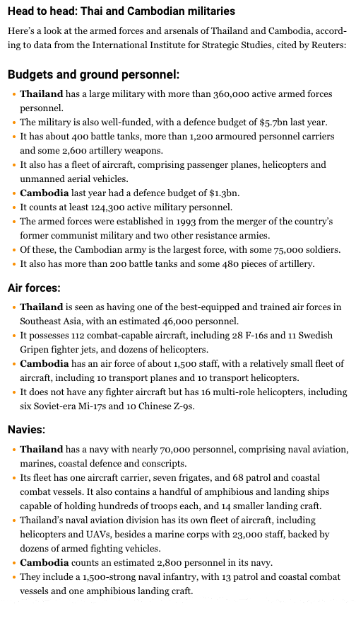 Media outlet Al Jazeera broke down how Thailand's military stacks up against Cambodia's in a side-by-side comparison