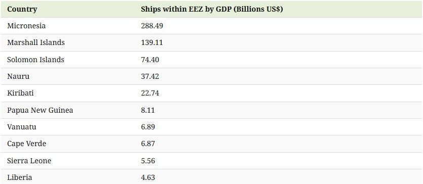 Here is a table showing the top 10 countries with the most PPWs located in their exclusive economic zones (EEZs), ranked by GDP: