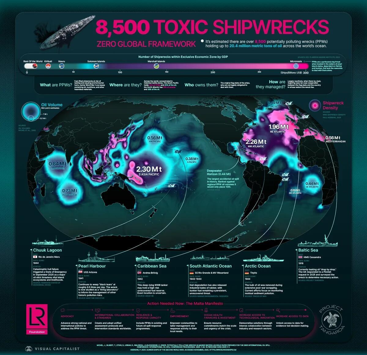 The Malta Manifesto, launched by Project Tangaroa, calls for a global framework to address the PPW threat. It outlines key actions, from identifying high-risk wrecks to supporting coastal nations with limited capacity.