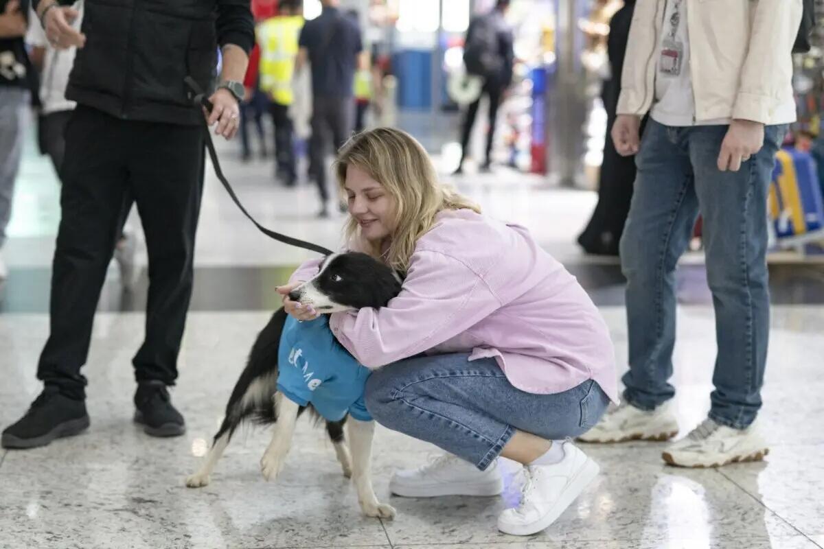 A traveller pets a therapy dog providing solace to stressed travellers before they board their flight at the Istanbul Airport, in Istanbul, on May 3, 2024. Yasin Akgul/AFP via Getty Images