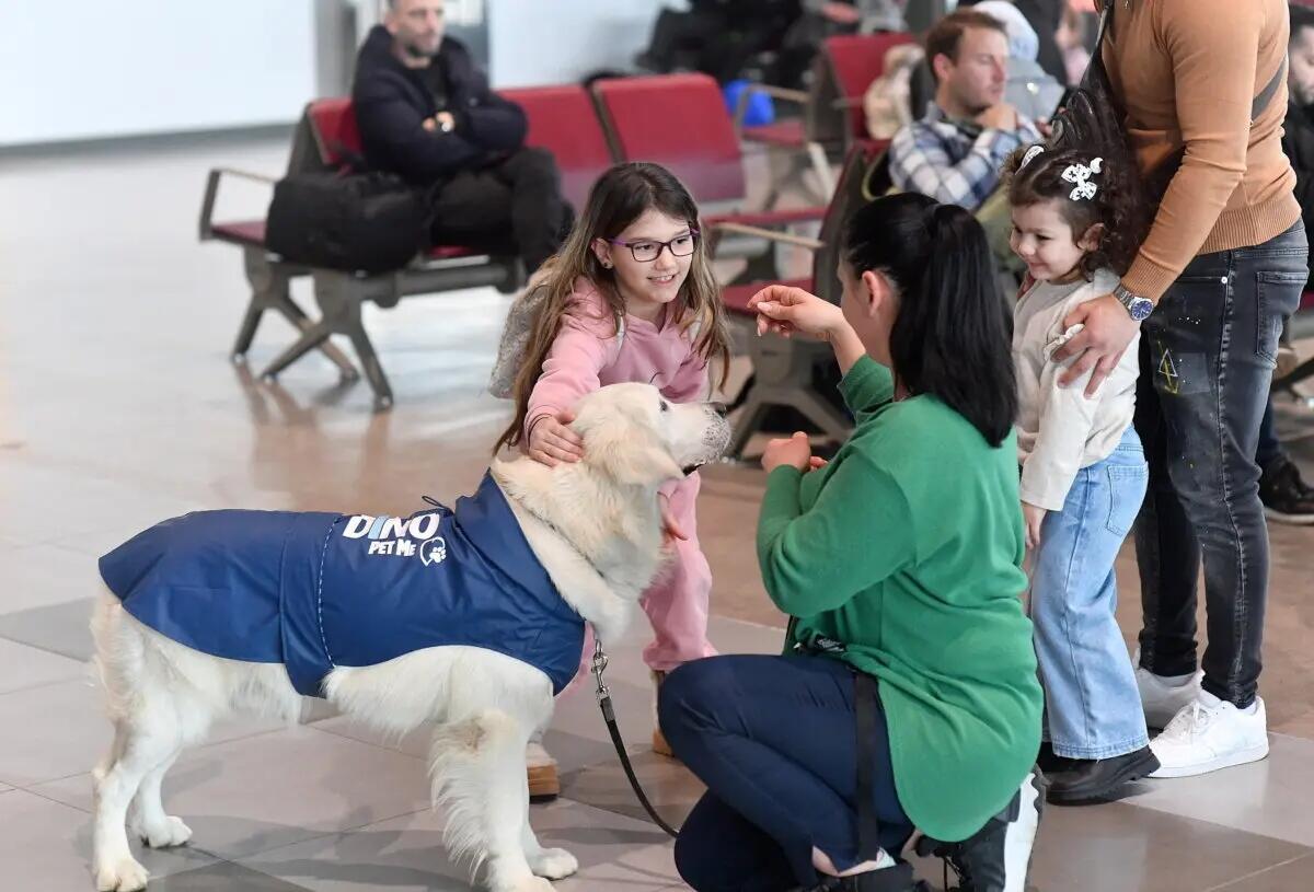 A girl plays and pets Dino, a golden retriever led by his trainer Vesna Kiskovska (R) at the Skopje International Airport, in Skopje, North Macedonia, on Jan. 29, 2025. Robert Atanasovski/AFP via Getty Images