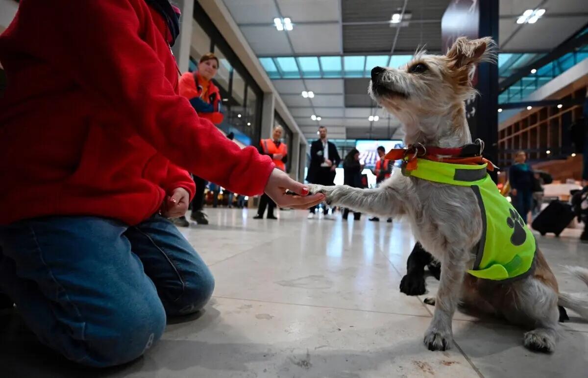 Comfort dog Pepper, a Terrier Mix, gives the paw to its trainer at the Berlin Brandenburg Airport BER in Schoenefeld, Germany, on Oct. 20, 2023. Tobias Schwarz/AFP via Getty Images