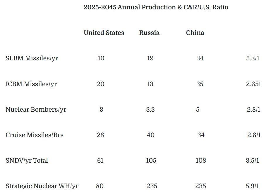 The chart represents the average annual production rate for three alternative nuclear forces if built over twenty years from 2025–45 based on projected force structures planned by the United States and in part planned and announced by Russia and China.