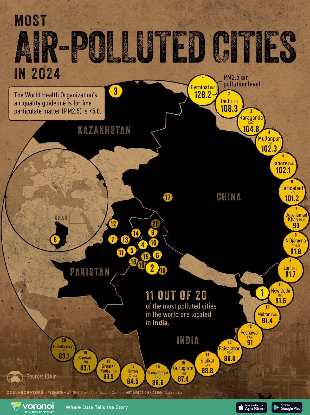 This map, via Visual Capitalist's Kayla Zhu, visualizes the 20 most air-polluted cities in 2024, based on fine particulate matter (PM2.5) data from IQAir.