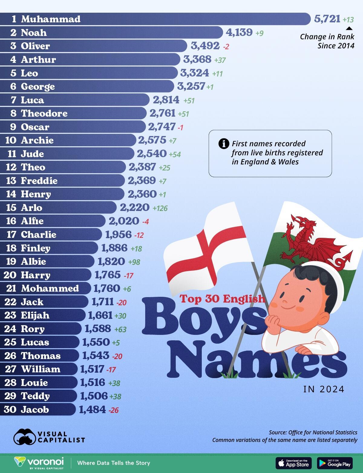 This visualization, via Visual; Capitalist's Pallavi Rao, ranks the thirty most popular names for boys registered in England and Wales last year, spotlighting newcomers and chart-toppers alike.
