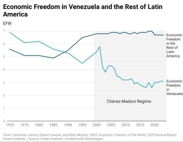 In 1970, Venezuela scored a little less than 7 on the Fraser Institute’s 10-point Economic Freedom of the World index, making it the 13th most economically free country in the world, just ahead of Japan.