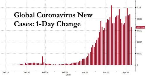 In some places, reopening isn't the craziest idea. As we noted last night, after weeks of "climbing the coronacurve", we finally have some good news - we are now officially over the "tipping point," as the global rate of infection growth has slowed from 90% W/W to just 38% W/W in the last fortnight (total infections: 2,157,108, deaths: 143,844, 6.7% mortality rate), and the number of global new daily cases has dropped to 65.6K, the lowest since the end of March.